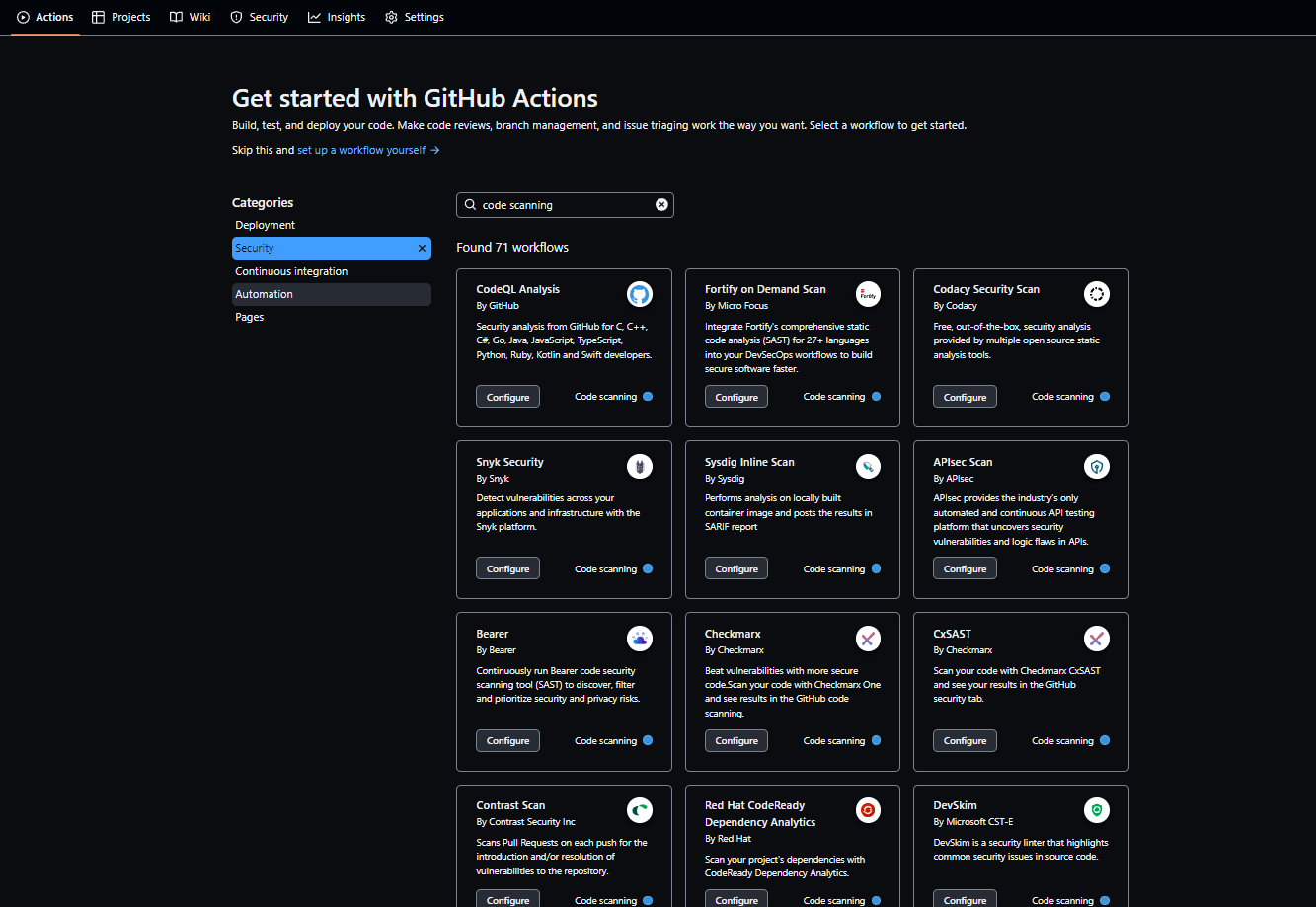 3. Click "Explore Workflows" to see all available code scanning tool options