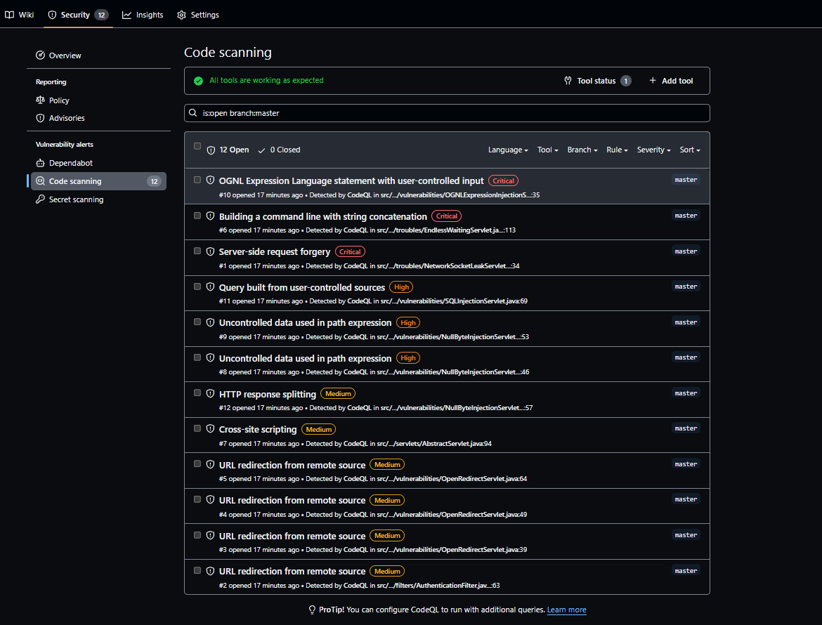 17. Go to the **Security** tab and select **code scanning** to see the results of the scan