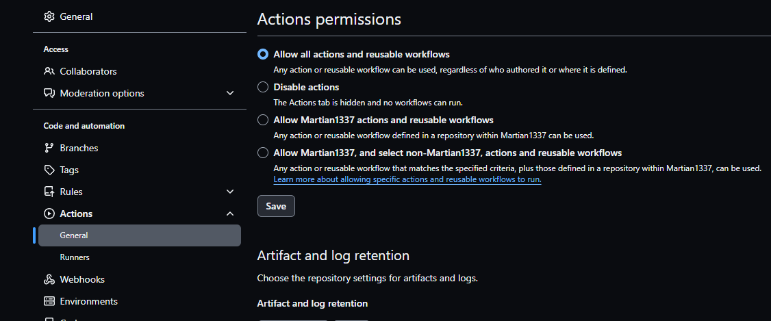 1. Configure Github Actions in the Setting tab of the repo that needs to be scanned. Select Desired setting and save.