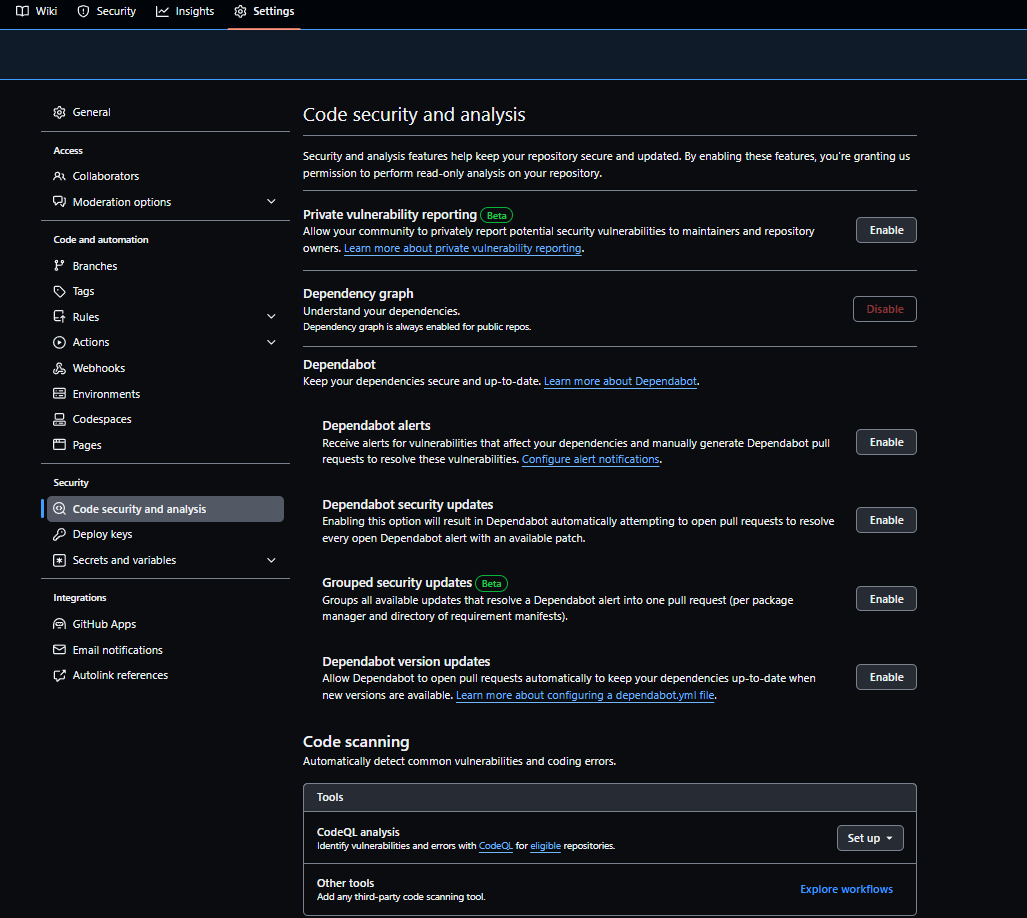 2. Now visit "Code Security and analysis in the security section of settings. You can now see that Code Scanning is available to setup.