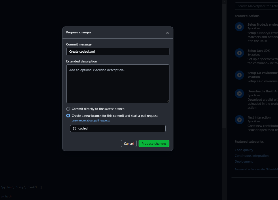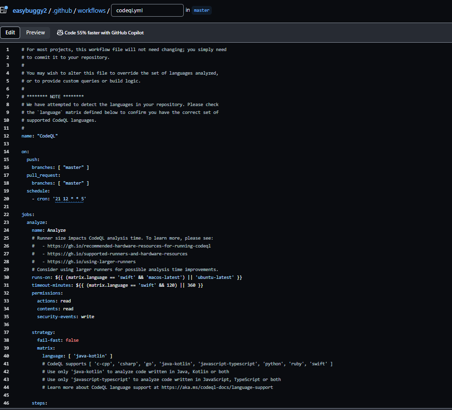 4. Select desired code scanning tool and edit the drafted YAML file if needed. For this example was selected: